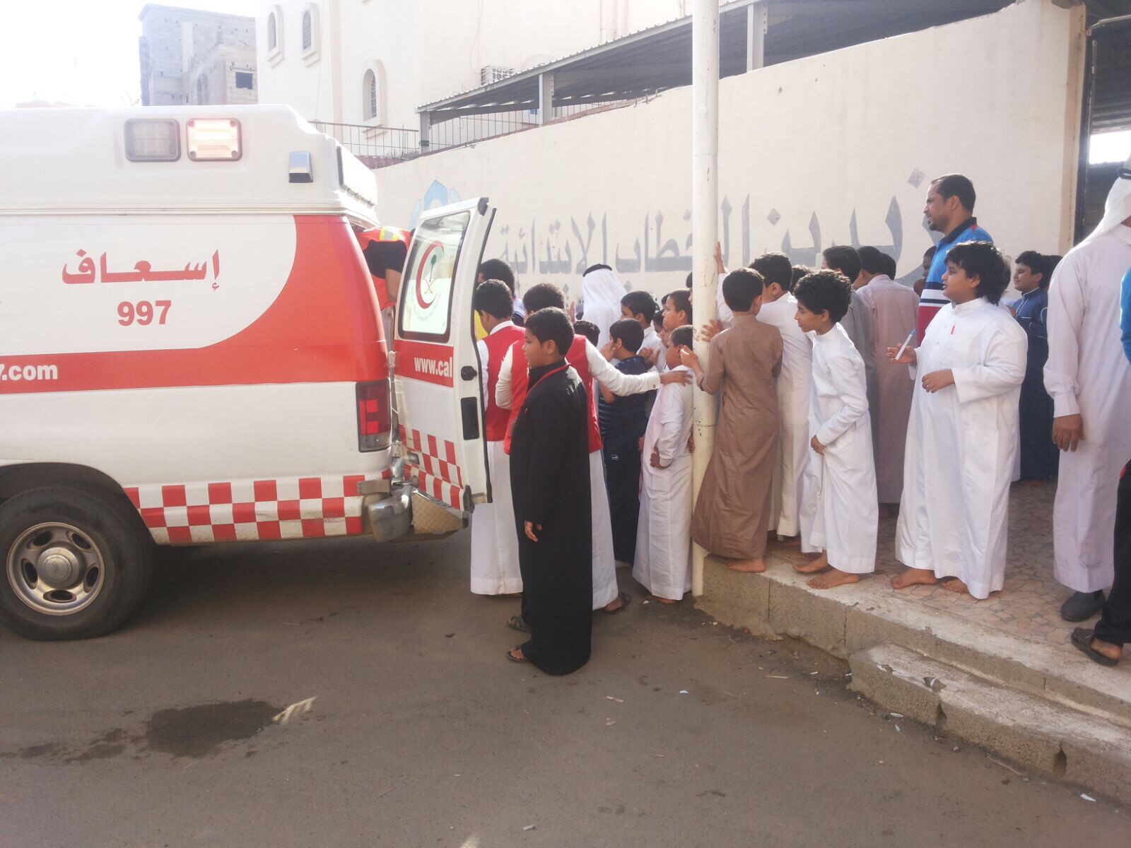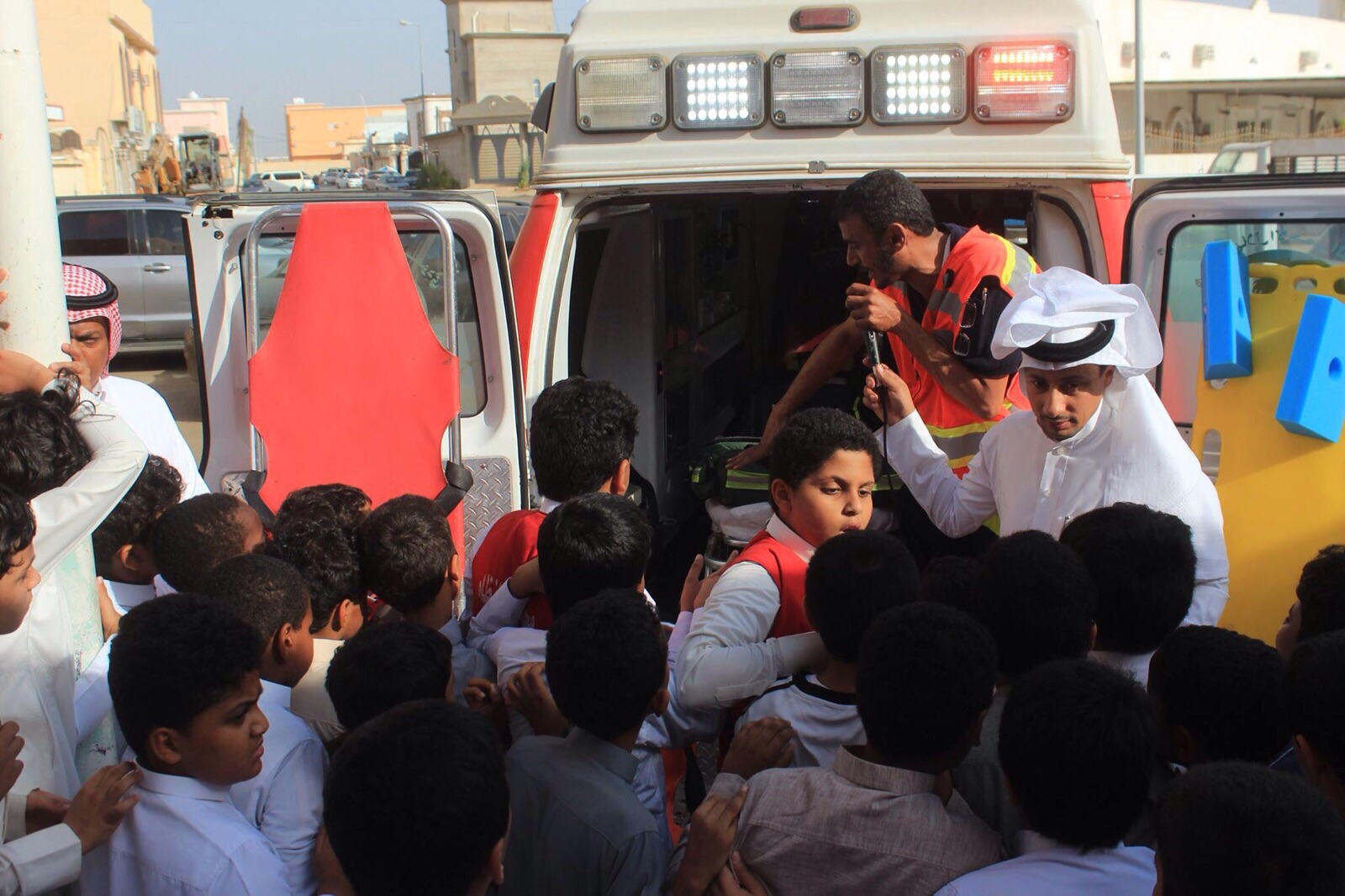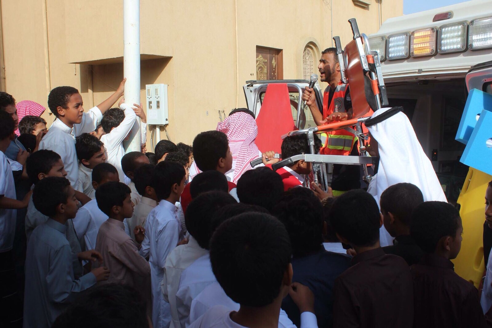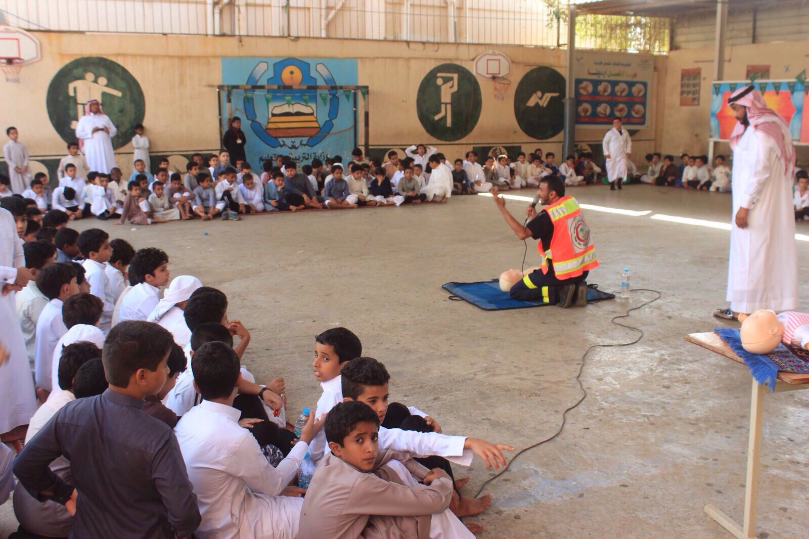 أقام مركز التدريب بهيئة الهلال الأحمر السعودي بجازان محاضرة عن الإسعافات الأولية بمدرسة زيد بن الخطاب الإبتدائية بأبو عريش اليوم الثلاثاء الموافق 1437/2/12 ، وذلك بناءا على طلب تقدمت به إدارة المدرسة لإدارة الهيئة برغبتهم إقامة هذه المحاضرة ، وقد تم الشرح للمعلمين والطلاب عن موضوعات عدة كالغصة والإغماء وكيفية التعامل مع هذه الحالات الطارئة وشملت أيضا المحاضرة التعريف بسيارة الإسعاف ومحتوياتها الطبية من ألواح خشبية ونقالات وجبائر واجهزة طبية كجهاز ( البروباك ) و(البلس أكسو ميتر ) وتعريف الطلاب على رقم طوارئ الهيئة (٩٩٧) في حالة مصادفتهم حادث مروري أو أي مشكله طارئة قد يتعرض لها أي شخص لا سمح الله وقد نالت المحاضرة على رضا واستحسان المعلمين والطلاب .