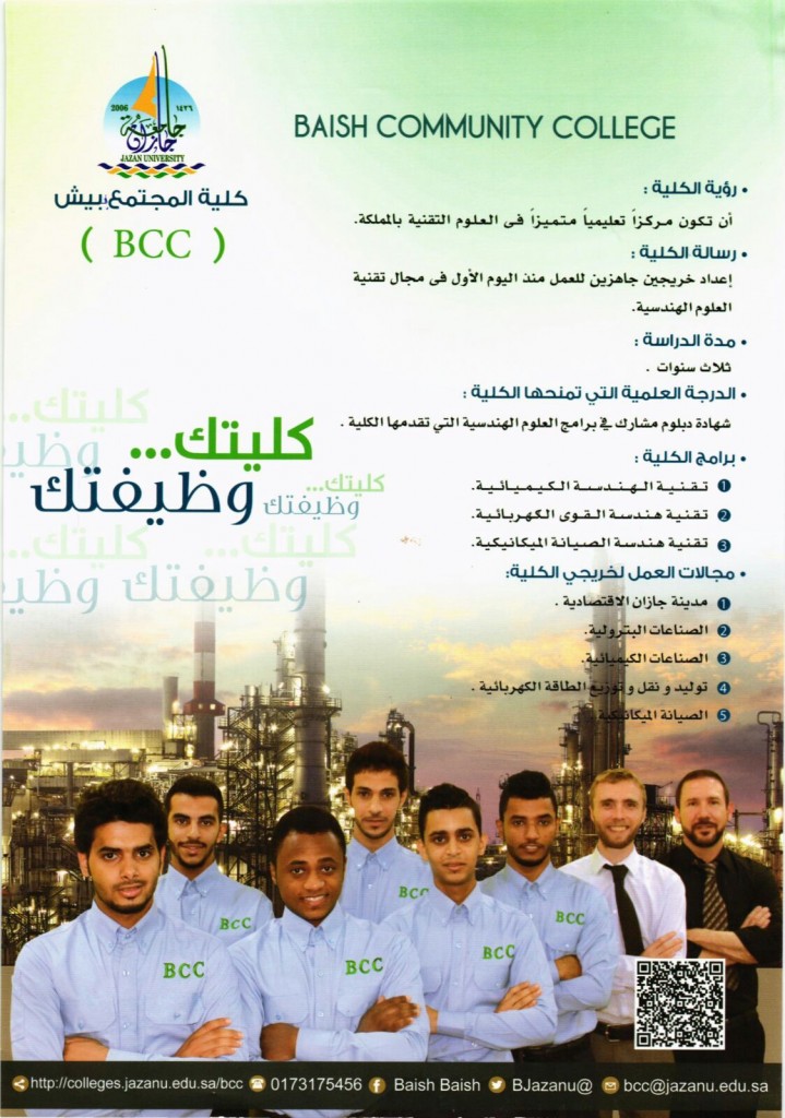 وأوضح عميد كلية المجتمع بمحافظة بيش المهندس أنور بن محمد آل عمر للطلاب أن التخصصات المتاحة للتسجيل بالكلية تشمل” تقنية الهندسة الكيميائية، وتقنية هندسة القوى الكهربائية، وتقنية هندسة الصيانة الميكانيكية”.