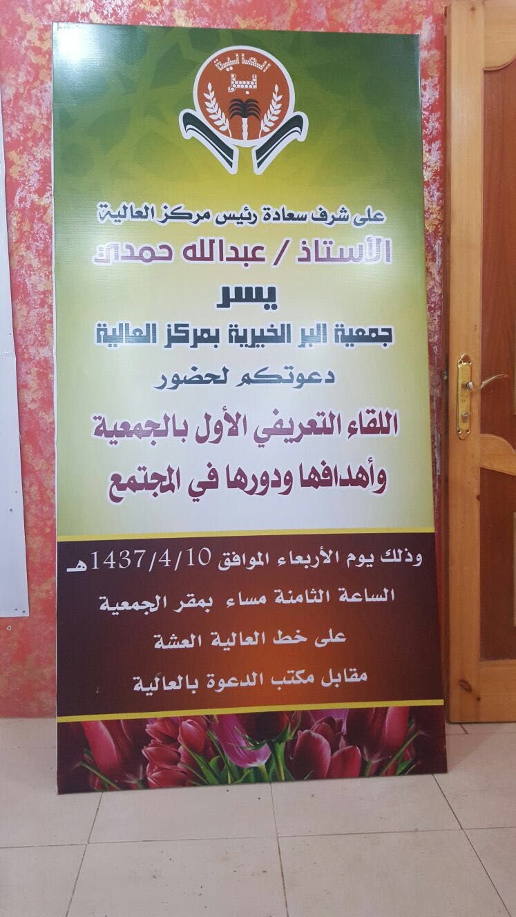 على شرف رئيس مركز العالية الاستاذ عبدالله حمدي وبحضور شيخ شمل العالية موسى ابراهيم النعمي. وشيخ شمل السادة والدهناء غالب. عرار النعمي. وجمع من شيوخ وأعيان وأهالي مركز العالية أقامت جمعية البر الخيرية بمركز العالية مساء أمس الاربعاء اللقاء التعريفي الاول بالجمعية وأهدافها ودورها في المجتمع وقدم الحفل الاستاذ يحيى القاضي وآيات من القرآن الكريم. تلاها الطالب احمد فقيهي ثم كلمة رئيس الجمعية الاستاذ يحيى حامظي ثم عرض مرئي لمشاريع الجمعية قدمه الاستاذ هادي حبيب وعرض مرئي لفريق سواعد الخير. ثم كلمة رئيس مركز العالية الاستاذ عبدالله حمدي شكر فيها حكومة خادم الحرمين الشريفين. وسمو ولي العهد وسمو ولي ولي العهد. والحكومة ثم تكريم الأعضاء المتعاونين. مع الجمعية وفي نهاية اللقاء سلم رئيس الحمعية سعادةًرئيس مركز درعا تذكاريا بهذه المناسبة.