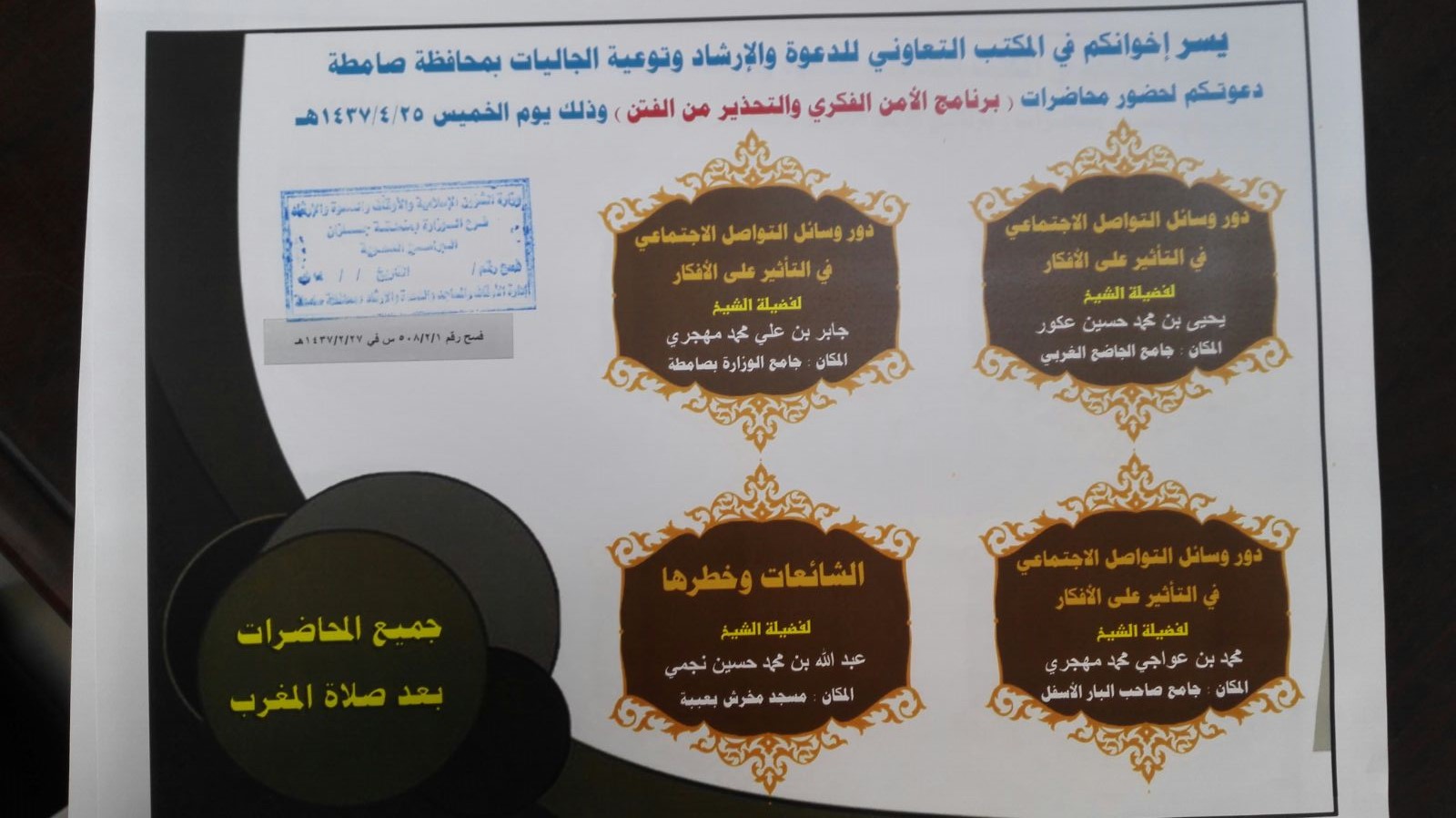 في ظل التموجات الفكرية المتطرفه التي تهدد خطر مملكتنا الغاليه وتصديا لتلك التيارات الساقطة دينيا ينظم مكتب الدعوة وتوعية الجاليات بمحافظة صامطه انطلاقامن مقره العامر بجامع الشيخ زيد المدخلي رحمه عدة محاضرات بعنوان دور وسائل التواصل الإجتماعي في التأثير على الأفكار يلقيها فضيلة الشيخ/يحيى محمدعكور بجامع الجاضع الغربي ويلقي نفس المحاضرة بجامع صاحب البار الأسفل فضيلة الشيخ/محمد بن عواجي مهجري ويلقي أيضا بنفس العنوان الشيخ جابر علي مهجري بجامع الوزاة بصامطه وكما يلقي قضيلة الشيخ الأستاذ/عبدالله بن محمدحسين النجمي محاضرة في نفس السياق بعنوان الشائعات وخطرها وكلها ستكون بيوم غد الخميس الموافق ٢٥/ ٤/ ١٤٣٧ هـ وقد أشار رئيس مكتب صامطة لتوعية الجاليات الشيخ /محمد زيد المدخلي ونائبه الشيخ /يحيى عكور بأهمية توعية الشباب بخطر الفكر الضال وسد طرقهم عبرمواقع التواصل الإجتماعي .