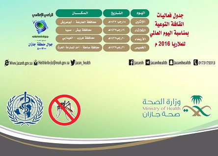 يدشن مدير عام الشئون الصحية بمنطقة جازان الدكتور محمد بن خالد العبدالعالي وبحضور عدد من مدراء الدوائر الحكومية والجهات المعنية القافلة التوعوية بمناسبة اليوم العالمي للملاريا ٢٠١٦م تحت شعار ” نداء لسد الفجوات التي تتخلل مجال الوقاية من الملاريا وعلاجها ودحرها ” وذلك بمقر محطة الملاريا بمحافظة العارضة يوم الاثنين الموافق ١٨ رجب لعام ١٤٣٧هـ