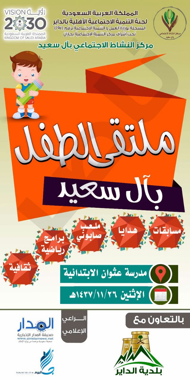 نظم مركز النشاط الاجتماعي بآل سعيد التابع للجنة التنمية الاجتماعية الأهلية بالداير ملتقى الطفل والذي أقيم في مدرسة عثوان الابتدائية اليوم الاثنين الموافق 1437/11/26 بتعاون ودعم من بلدية محافظة الداير بني مالك .