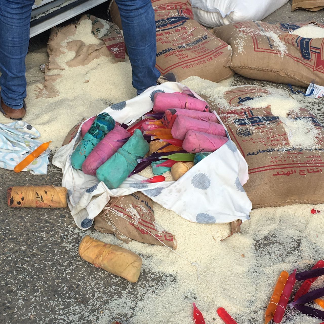 مبينا بأنه في العملية الثالثة تمكن رجال اﻷمن بشرطة الفطيحة من كشف حيلة مبتكرة وماكرة أنتهجها أحد المهربين لتهريب كميات من القات المحظور داخل أكياس اﻷرز ولكن حيلته لم تنطلي على رجال اﻷمن وتمكنوا من كشفها واﻹطاحة بالمهرب.