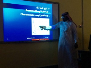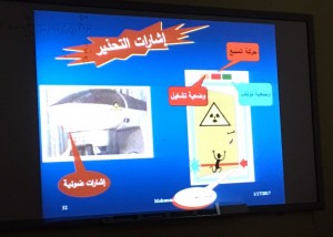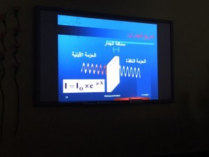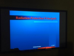 ثم استعرض كافة الوسائل المستخدمة في الوقاية من الاشعاع سواءا في أقسام الاشعة والتي تحمي العاملين من التعرض المباشر للاشعاع وأهمية فحصها بشكل دوري عن طريق المسح الاشعاعي مثل حائط غرفة الاشعة المكون من مادة الرصاص التي تقي من اختراق كمية الأشعة الصادرة من الجهاز الى جسم الإنسان مباشرة .