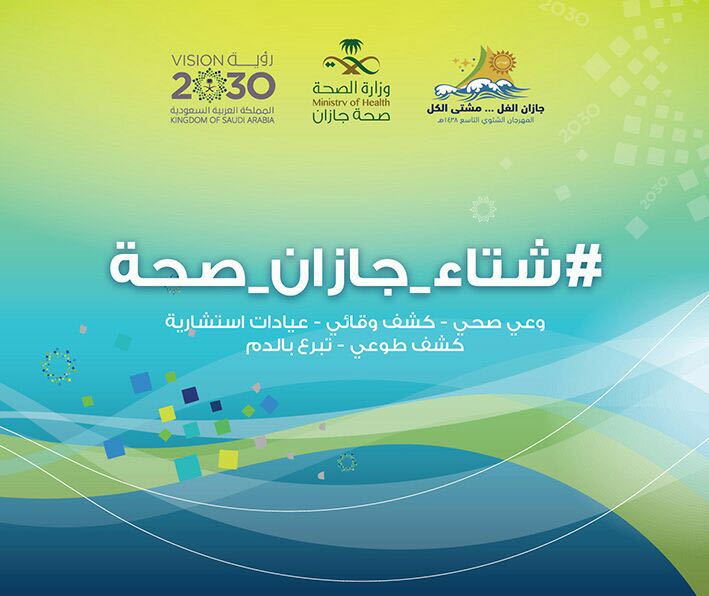 تفعيلاً للدور المجتمعي لوزارة الصحة ، وانطلاقاً من الدور الذي يلعبه مهرجان جازان الشتوي في الوصول إلى كافة شرائح المجتمع من خلال البرامج والفعاليات التي ينفذها ، تتواجد صحة جازان ضمن هذه الفعاليات بخيمة توعوية متكاملة تقدم من خلالها خمسة محاور أساسية ( وعي صحي – كشف وقائي – مشورة طوعية – عيادات استشارية – تبرع بالدم ).