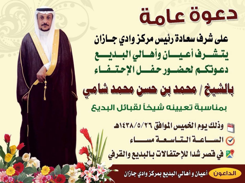 أنهت اللجان الخاصة بتنظيم مراسم الحفل ببلدة البديع التابعة لمركز وادي جازان تحضيراتها بشكل مكثف استعداداتها لإقامة احتفالات أهالي وأعيان البديع بمناسبة صدور قرار صاحب السمو الملكي الأمير محمد بن ناصر بن عبد العزيز بتنصيب الشيخ محمد بن حسن شامي شيخا لقبائل البديع خلفا لوالده رحمه الله ، حيث دعا أهالي وأعيان البديع شخصيات بارزة وعدد من الضباط ومديري الإدارات والمشايخ بمنطقة جازان لحضور المناسبة والتي ستقام مساء الخميس 26 / 5 / 1438هـ على شرف رئيس مركز وادي جازان الأستاذ عبدالله البراق وشيخ شمل قبائل وقرى وادي جازان الشيخ محمد بن حسين عقيل وذلك بقاعة شذا للمناسبات بالبديع والقرفي ، وستشتمل فقرات الحفل على عدد من الفقرات والبرامج المتنوعة ومن أبرزها الكلمات الخطابية والقصائد الشعرية ومشاهد تحكي تاريخ البديع وتطورها من الناحية العمرانية والخدمات الحكومية والنهضة الحديثة في كافة المجالات بالإضافة إلى مشاركة لمجموعة من الأطفال ضمن برامج الحفل ، وسيتم في نهاية الحفل تقديم العديد من الهدايا القيمة للمحتفى به الشيخ محمد بن حسن شامي قبل تناول وجبة العشاء المعدة لهذه المناسبة الكبرى .