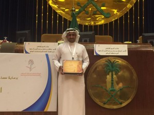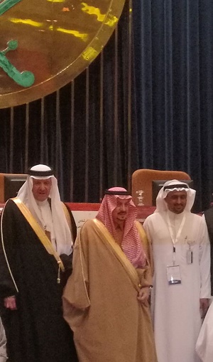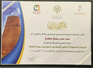 كرم صاحب السمو الملكي اﻷمير فيصل بن بندر بن عبدالعزيز أمير منطقة رئيس مجلس التنميه السياحه بمنطقه الرياض المرشد السياحي بمنطقة جازان رئيس المجلس البلدي بقوز الجعافرة وعضو لجنه التنميه السياحيه بمحافظه بصبيا اﻷستاذ عبده بن حسن مشني الجعفري بحضور صاحب السمو الملكي اﻷمير سلطان بن سلمان بن عبدالعزيز رئيس الهيئة العامة للسياحة والتراث الوطني بالمملكة العربية السعودية خلال رعايتهما لفعاليات المنتدى الخامس للمرشدين السياحيين والذي عقد بالعاصمة الرياض مساء امس.
