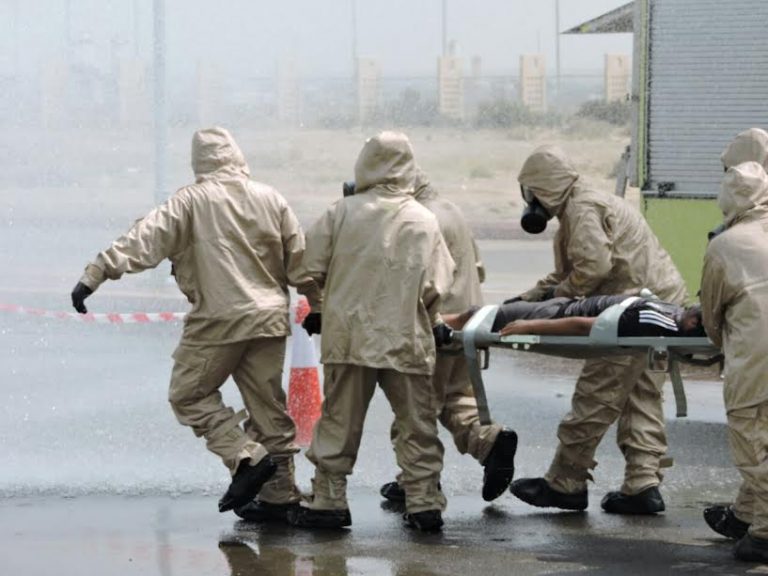 وشملت الخطة اكتشاف وجود سلاح كيميائي “غاز الخردل” في الموقع حيث قام فريق الرصد بتنفيذ خطة التدخل في الحوادث الكيميائية واعلان بلاغ طبي أحمر 1 والقيام بأعمال التطهير وتوجيه الحالات بمنطقة فرز طبي 2 حيث تم تطهيرها بمقطورات التطهير وإطفاء الحريق بالقواذف الذكية وتحديد نقطة آمنة كنقطة تجمع بالقرب من موقع الحادث وموقع للإسناد .