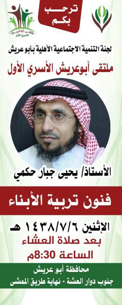تنظم لجنة التنمية الاجتماعية الأهلية بمحافظة أبوعريش في منطقة جازان مساء اليوم الاثنين , دورة مجانية في ” فنون تربية الأبناء ” يُقدمها الأستاذ يحي بن جبار حكمي , وذلك بساحة الاحتفالات جنوب دوار العشة.