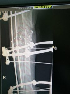 وقد تمت العملية على مرحلتين الأولى تنظيف الجروح وتركيب جهاز ( أليزاروف ) وعمل قص عظمي وتطويل تدريجي لتعويض العظم من نفس الساق، وتضمنت المرحلة الثانية طعم عظمي عند التقاء أطراف العظمتين وقد تمت العملية بنجاح بحمد الله.