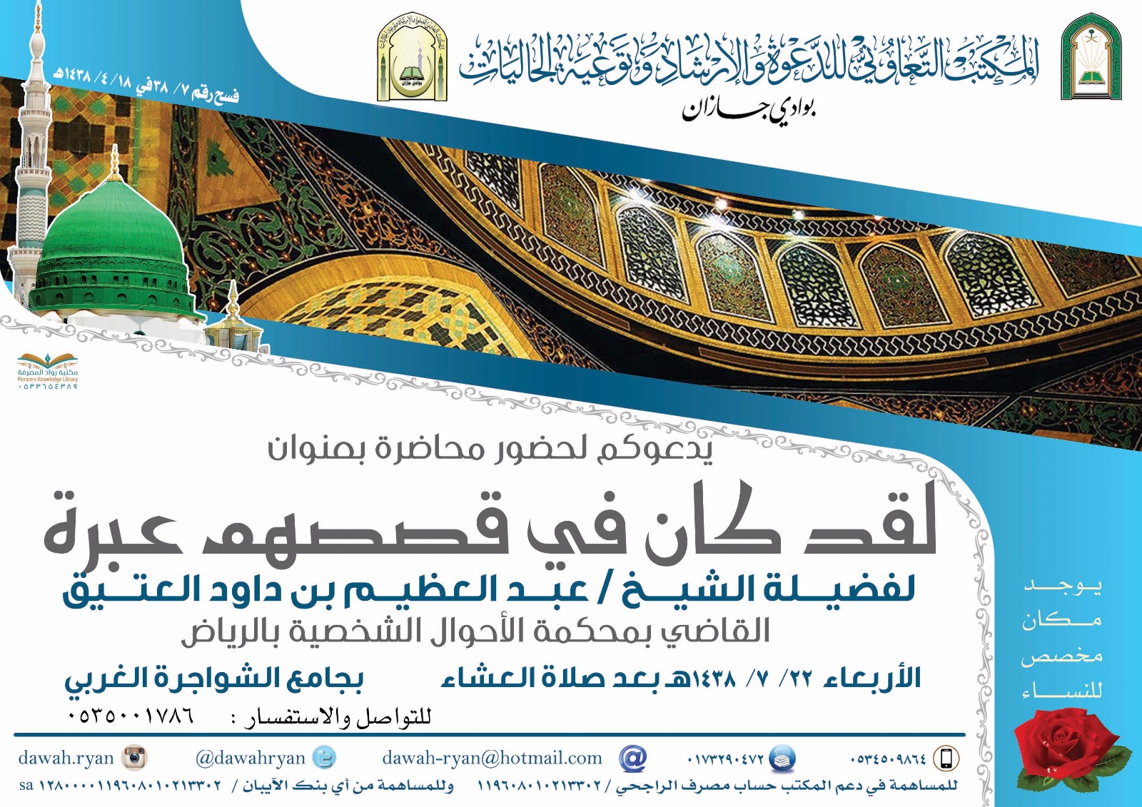يقيم المكتب التعاوني للدعوة والإرشاد وتوعية الجاليات بوادي جازان , محاضرة بعنوان ” لقد كان في قصصهم عبرة ” , لفضيلة الشيخ : عبدالعظيم بن داوود العتيق القاضي بمحكمة الأحوال الشخصية بالرياض , وذلك بعد صلاة العشاء ليوم الأربعاء 22-7-1438هـ , بجامع الشواجرة الغربي.