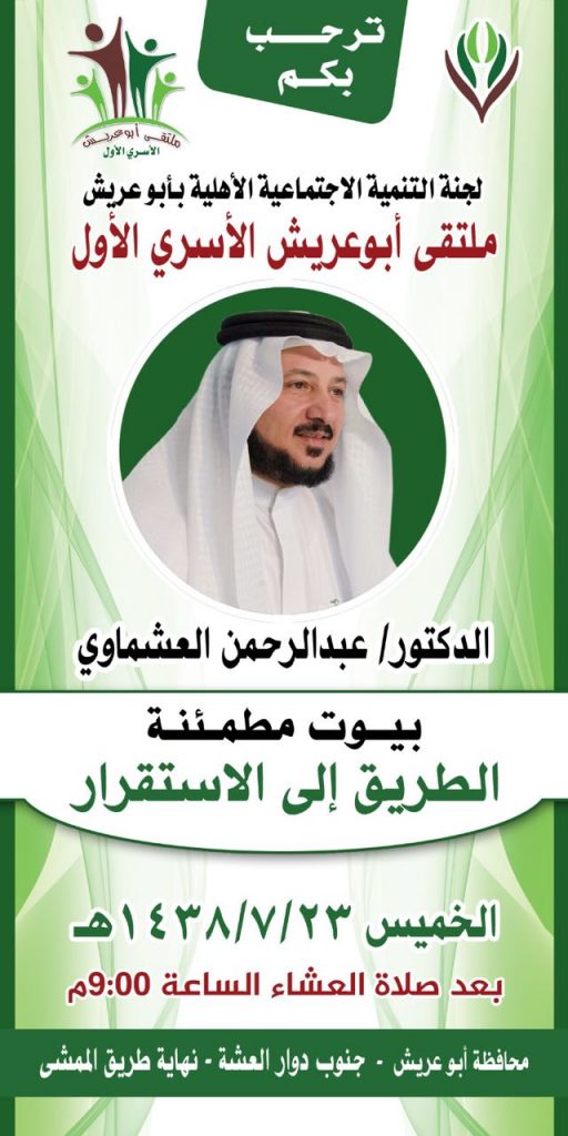 تنظم لجنة التنمية الاجتماعية الأهلية بمحافظة أبو عريش في منطقة جازان غدا الخميس برنامجاً بعنوان ” بيوت مطمئنة “, يُقدمه الدكتور عبدالرحمن العشماوي وذلك بمقر ملتقى أبوعريش الأسري الأول الذي تنظمه اللجنة حالياً والدعوة عامة