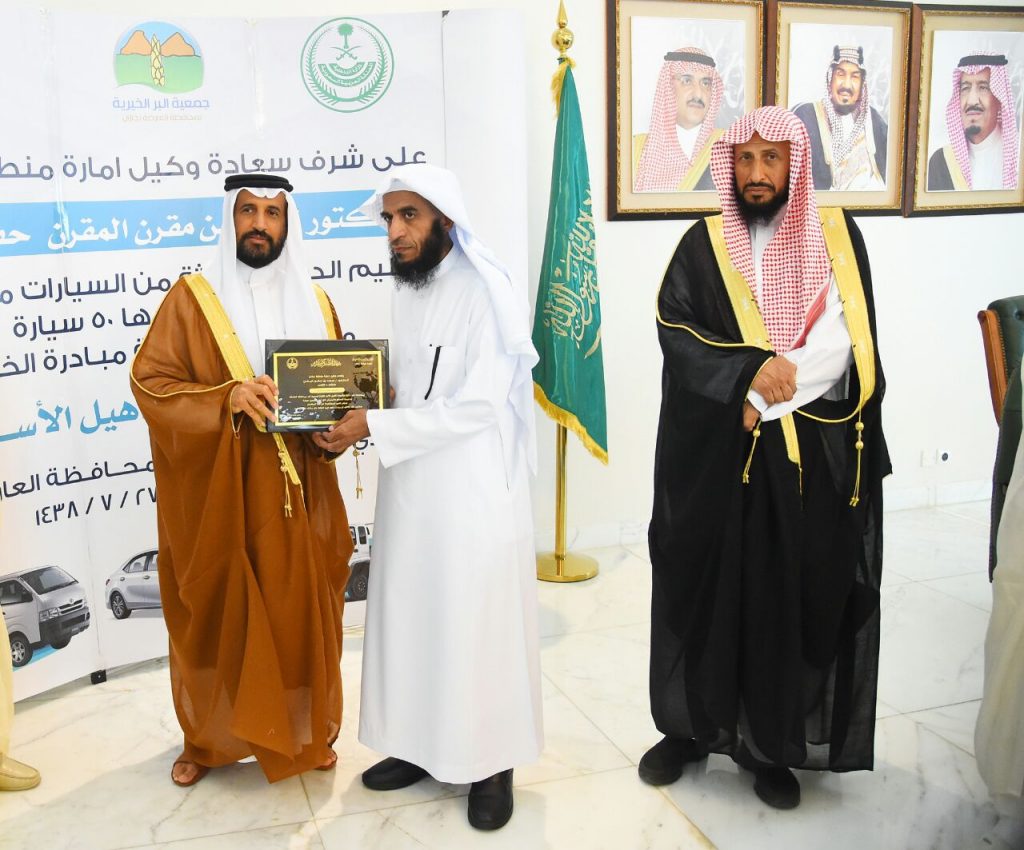 رعى وكيل أمارة منطقة جازان الدكتور سعد بن مقرن المقرن امس بصالة الاجتماعات بالإمارةحفل تسليم الدفعة الثالثة من السيارات المقدمة من شركة مبادرة الخير ضمن مشروع تأهيل الأسر الذي ترعاه جمعية البر الخيرية بمحافظة العارضة بحضور المدير التنفيذي لشركة مبادرة الخير الشيخ عبدالعزيز العصيمي والمهندس عمر المقرن والمهندس عبد الله الهزاع والشيخ علي بن حسن ومدير مركز التنمية الاجتماعية بالمنطقة الأستاذ خالد معافا .