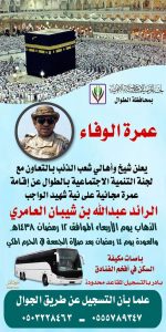 دشن وكيل محافظة الطوال الأستاذ جابر بن محمد عواف بعد ظهر يوم الأربعاء الموافق ١٤٣٨/٩/١٢حملة عمرة الوفاء على نية الشهيدين الشهيد : الرائد عبدالله شيبان العامري والشهيد :تركي حسن عكور