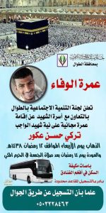 وستكون العودة يوم الجمعة الموافق ١٤٣٨/٩/١٤ بعد صلاة الجمعة من جانبهم وجه المعتمرون شكركم لأسر الشهداء ولمشائخ وأهالي قريتي شعب الذئب والعكرة وللجنة التنمية بالطوال وسألوا ألله المغفرة والرحمة للشهداء وأن يتقبل هذا العمل من المنظمين لوجهه تعالى على نية الشهداء وأن يجزء القائمين على هذه الحملة خير الجزاء .