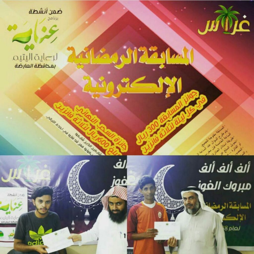 اختتمت مساء امس فعاليات المسابقة الرمضانية ضمن مشروع غراس التابع لبرنامج عناية لرعاية اليتيم بجمعية البر الخيرية في محافظة العارضة بالشراكة مع مكتبي الدعوة والإرشاد وتوعية الجاليات في كل من مركز الحميراء وجبال العبادل والتي انطلقت في بداية شهر رمضان الكريم واستمرت حتى التاسع عشر من الشهر ذاته وشهدت قبولاً متزايداً وانتشاراً واسعاً في المجتمع .
