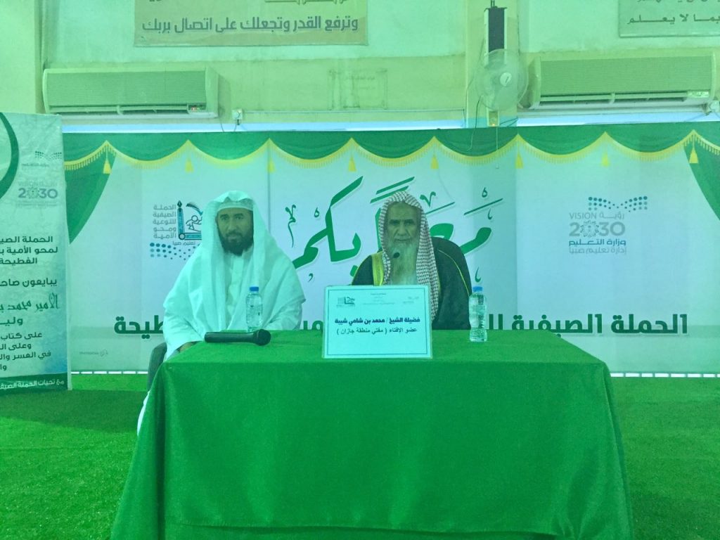 ألقى مفتي منطقة جازان فضيلة الشيخ محمد بن شامي شيبة ، مساء الإثنين 23-10-1438هـ، محاضرة في المقر الرئيسي لحملة التوعية ومحو الأمية بقطاع الفطيحة بعنوان: “الدين علم وعمل”.