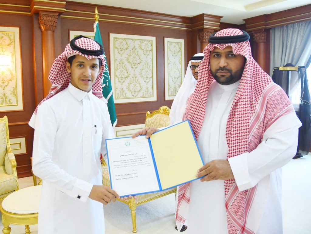استقبل صاحب السمو الملكي الامير محمد بن عبدالعزيز بن محمد امير منطقة جازان بالنيابه اصغر سفير للمشروع الوطني للوقاية من المخدرات (نبراس) الموهوب: خالد بن شايع القحطاني بعد تفوقه في دورة اللغة الإنجليزية بالمملكة المتحدة بمعهد LSC STANTON العالمي بلندن