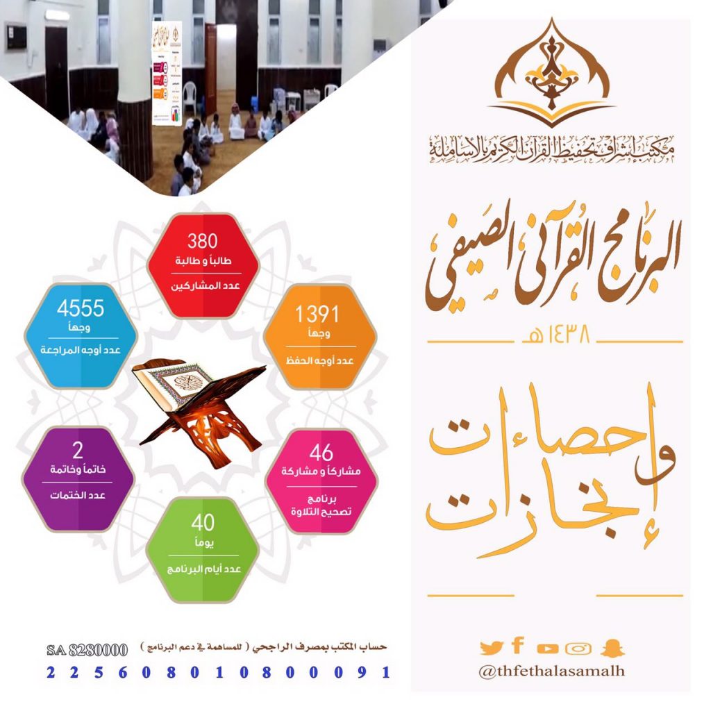 اختتم مكتب إشراف حلقات تحفيظ القرآن الكريم بالأساملة التابع لجمعية تحفيظ القرآن الكريم الخيرية بمحافظة أبوعريش أمس, البرنامج القرآني الصيفي الثاني, وذلك ضمن برامج المكتب خلال صيف العام الحالي 1438هـ .