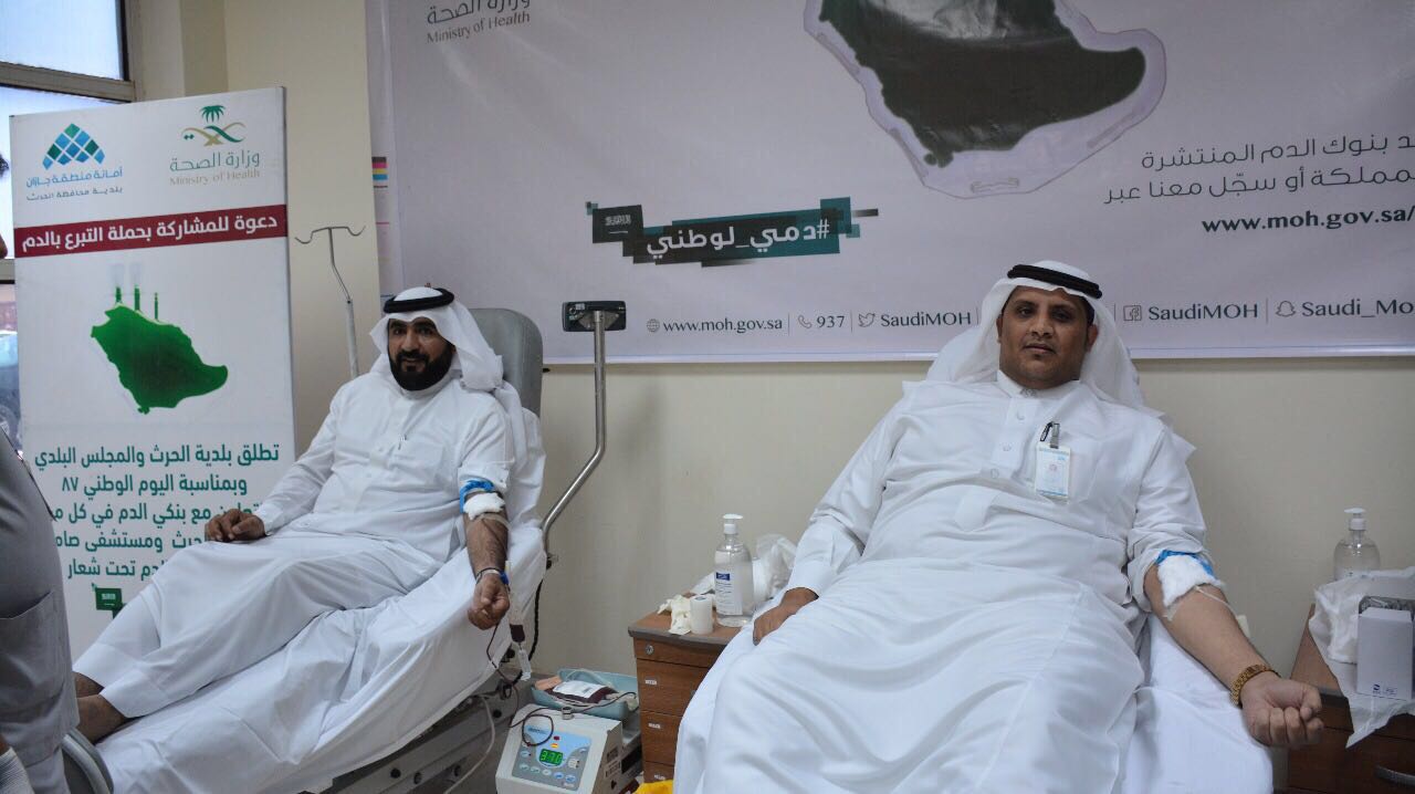 دشن محافظ الحرث الأستاذ /سفر بن سعد الشهراني ورئيس بلدية الحرث المهندس /أحمد بن حسين مجيري ورئيس المجلس البلدي الاستاذ /علي ابو عقيله حملة التبرع بالدم تحت شعار “دمي لوطني” وذلك ضمن فعاليات الإحتفال بذكرى اليوم الوطني 87 التى نفذتها إدارة مستشفى الحرث ومستشفى صامطه العام ممثلاً بقسم المختبر وبنك الدم بالمستشفى .