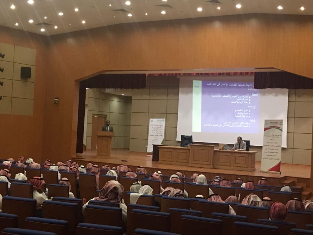 نظم فرع هيئة الهلال الأحمر السعودي بمنطقة جازان بالتعاون مع جامعة جازان صباح اليوم الإثنين الموافق 1439/1/26رمحاضره بعنوان ( القانون الدولي الإنساني ، نشاته وأسسه ومجالاته وآلياته) وذلك على مسرح مجمع الكليات بمحافظة أبوعريش بحضور وكيل كلية الشريعه والقانون الدكتور الأستاذ محمد ناصر جده ، ورئيس قسم القانون الأستاذ  عبدالله النجمي  وطلاب القانون وعدد من الحضور من مختلف الجهات الحكوميه بالمنطقة ومن منسوبي الهيئة .