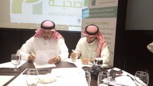 وفي الختام تم توقيع عقد الإتفاقية بين شركة أفاق العراب التجارية يمثلها الدكتور فرج شاهين ومؤسسة Br_design يمثلها الأستاذ نايف الحكمي.