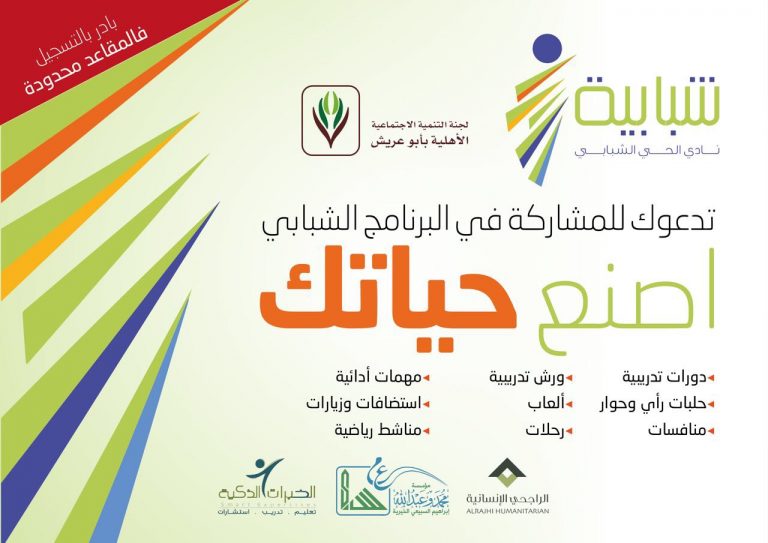 تعلن لجنة التنمية الاجتماعية الأهلية بأبوعريش عن بدء التسجيل في برنامج نادي الحي الشبابي، مسار “أصنع حياتك ” برعاية مؤسسة السبيعي الخيريةومؤسسة الراجحي الإنسانيةوشركة الخبرات الذكية وذلك بالتعاون مع مركز توطين بلجنة التنمية بصبيا، والذي يستهدف طلاب المرحلة الثانوية.