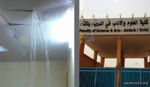 مع هطول الأمطار على محافظة الدرب , كان نصيب كلية البنات مضاعفا وشكل خطورة ولا يزال , مما يشير إلى قمة الإهمال في تنفيذ الاشتراطات التي تنص على سلامة المبنى لمدة لا تقل عن 25 عاما .
