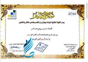 هذا وقد قدم الأستاذ سعد نامس خالص شكره وتقدير لعميدة الكلية التقنية وكافة منسوبيها على هذا التكريم متمنيا لهم دوام التوفيق.