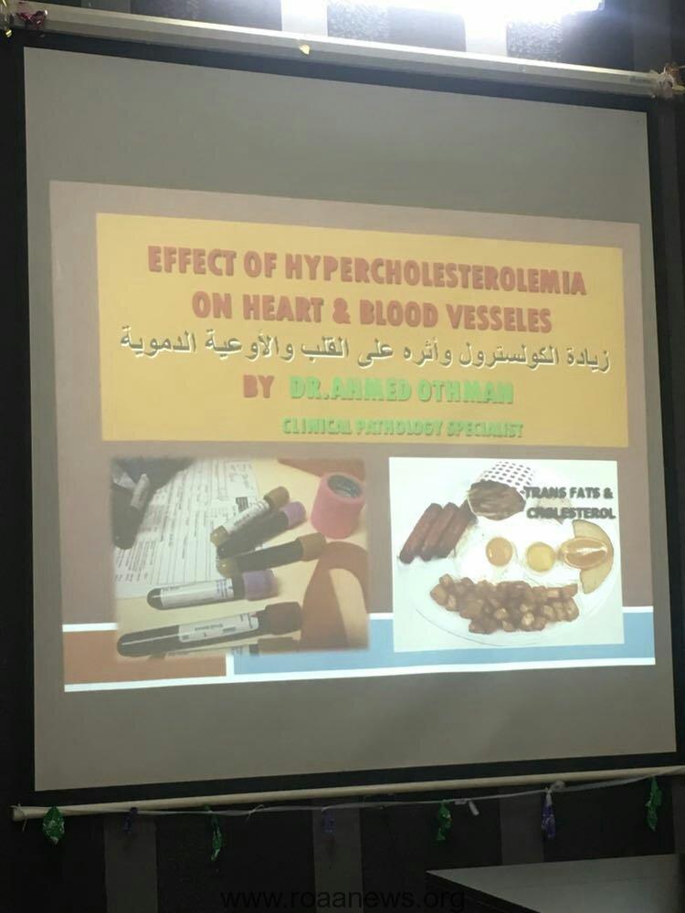 وقد قام بإلقائها الدكتور / أحمد عثمان طبيب نائب المختبرات أوضح فيها أسباب ارتفاع نسبة الكولسترول ومدى تأثيره على القلب و الأوعية الدموية وطرق الوقاية منه وكانت تستهدف كلاً من الأطباء و منسوبي قسم التمريض و كذلك منسوبي قسم المختبر بهدف رفع مستوى الوعي فيما يتعلق بزيادة نسبة الكوليسترول