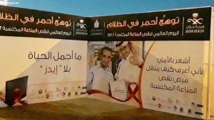 شهدت الفعاليات إطلاق المناطيد المضيئة في سماء الكورنيش الصحة والجامعة في جازان تتألقان في التوعية بالإيدز خديجة جلي صحيفة صوت جازان في مناسبة لفتت أنظار المتنزهين على كورنيش جازان الشمالي فعلت “صحة جازان” و”جامعة جازان” اليوم العالمي لنقص المناعة المكتسبة “الإيدز” بحضور عميد كلية الطب بجامعة جازان الدكتور علي سويد ومساعد المدير العام للخدمات العلاجية بصحة جازان الدكتور علي المدير والدكتورة البتول سليمان استشارية الأمراض المعدية وعدد من الأطباء المتخصصين بالكورنيش الشمالي بجازان، مساء الخميس (21 ديسمبر 2017). وقد اشتملت الفعاليات، التي أقيمت تحت شعار “توهج أحمر في الظلام”، على عدد من الفقرات التوعوية والتثقيفية والترفيهية على المسرح المفتوح بالإضافة إلى عربات متنقله للتبرع بالدم، وقياس ضغط الدم، وقياس السكر، والفحص الطوعي، كما شملت لأول مرة إطلاق ٥٠ منطاد مضيء في سماء الكورنيش، وفعالية المرسم الحر واستديوهات للتصوير بحضور عدد من منسوبي صحة جازان وجامعة جازان ومتطوعيين من جمعية منار للاعلام وجمعيه الاحسان الطبية ومجموعة وثق الاعلامية ، وعدد من المتطوعين بالفرق التطوعية بأمانة جازان. كما شهدت الفعاليات مشاركة فريق جازان رايدرز للدرجات الهوائية بعروض على الكورنيش وساهم الفريق في توزيع المنشورات التوعوية الخاصة بالمناسبة. وتهدف الفعالية إلى رفع مستوى الفهم والوعي الصحي والثقافي للمواطنين والمقيمين عن مرض نقص المناعة المكتسبة وكيفية انتقاله طرق الوقايه منه والحد من انتشاره بوسائل مبتكرة وجاذبة للانتباه. كما أن هذه الفعالية من شأنها زيادة الوعي لدى طلاب الكليات الصحية والممارسين الصحيين بكيفية التعامل مع المصابين ومنع انتشار الإصابة أثناء تقديم الخدمة الصحية، والحماية لدى المرضى المصابين، إلى جانب تقديم الكشوفات والاجابة عن الاستفسارات الطبية للجنسين.