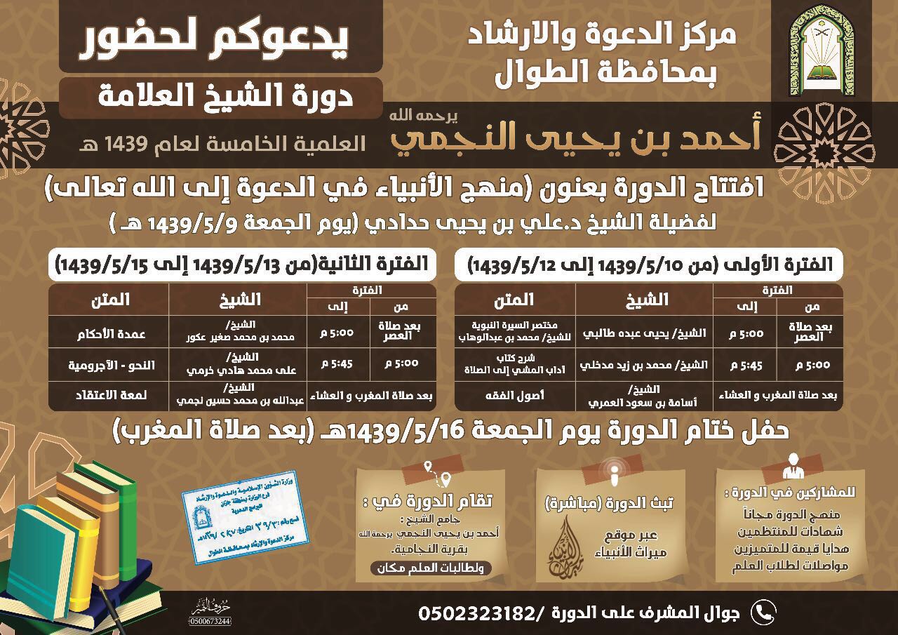 يرعى مساعد مدير عام الشؤون الإسلامية والدعوة والإرشاد بمنطقة جازان سعادة المهندس محمد بن عبدالسلام عاشور مساء غدا الجمعة حفل إفتتاح دورة الشيخ العلامة أحمد بن يحيى النجمي يرحمه الله العلمية الخامسة لعام ١٤٣٩هـ بمقر الدورة في جامع الشيخ أحمد بن يحيى النجمي بقرية النجامية وذلك بعد صلاة المغرب مباشرة بمحاضرة للدكتور علي بن يحيى حدادي بعنوان ( منهج الأنبياء في الدعوة إلى الله )
