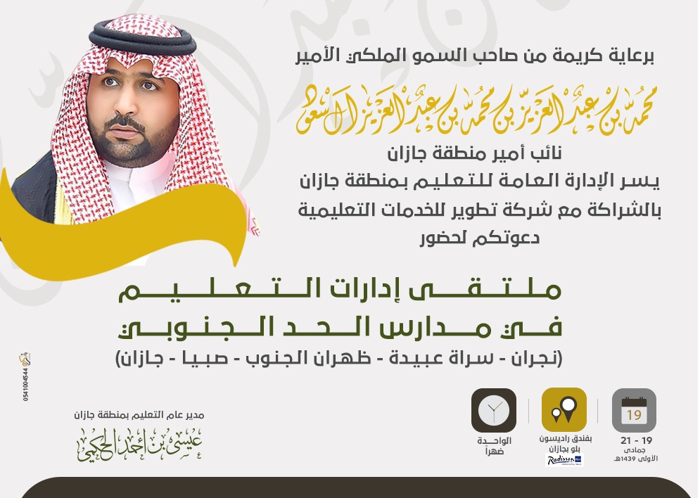 يرعى صاحب السمو الملكي الأمير محمد بن عبدالعزيز بن محمد بن عبدالعزيز آل سعود نائب أمير منطقة جازان غدا الاثنين انطلاق فعاليات ملتقى إدارات التعليم في الحد الجنوبي الذي تستضيفه الإدارة العامة للتعليم بمنطقة جازان بالشراكة مع شركة تطوير للخدمات التعليمية وبحضور نائب وزير التعليم الدكتور عبدالرحمن العاصمي ومديري إدارات ومكاتب التعليم في الحد الجنوبي وذلك بفندق راديسون بلو.