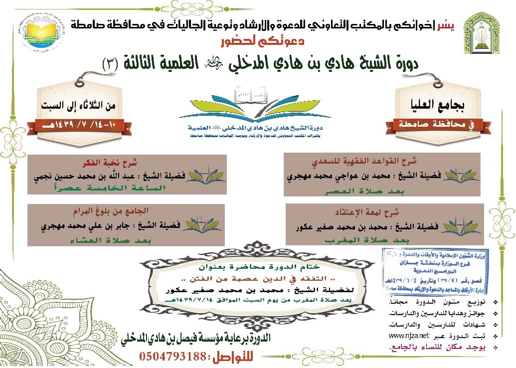 تنطلق غدا الثلاثاء 1439/7/10هـ دورة الشيخ هادي بن هادي المدخلي_ رحمه الله العلمية الثالثة وذلك بجامع العليا بمحافظة صامطة والتي ينظمها المكتب التعاوني للدعوة والإرشاد وتوعية الجاليات بالمحافظة برعاية من مؤسسة فيصل بن هادي المدخلي.
