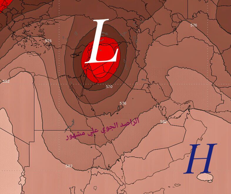 حيث تشير آخر توقعات خرائط النماذج العددية العالمية إلى تعمق لمنخفض جوي متوسطي على بلاد الشام مما يساعد في امتداد للاخاديد الباردة في طبقات الجو العليا على أجواء الجزيرة العربية يصاحبها استجابة سطحية دافئة مع امتداد للمد الرطوبي من بحر العرب والقرن الأفريقي وأيضا نشاط وفاعلية منخفض البحر الأحمر الحراري.