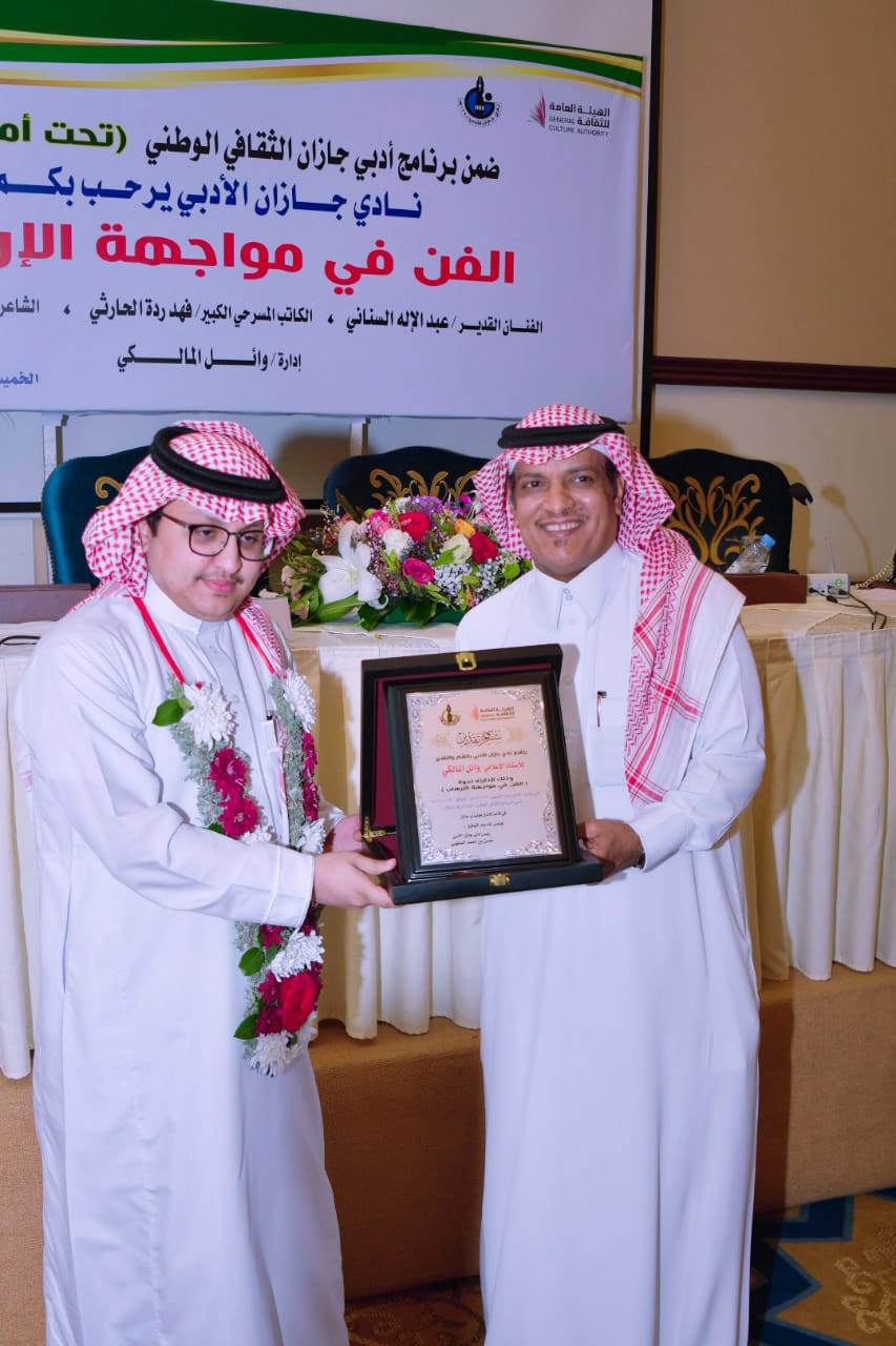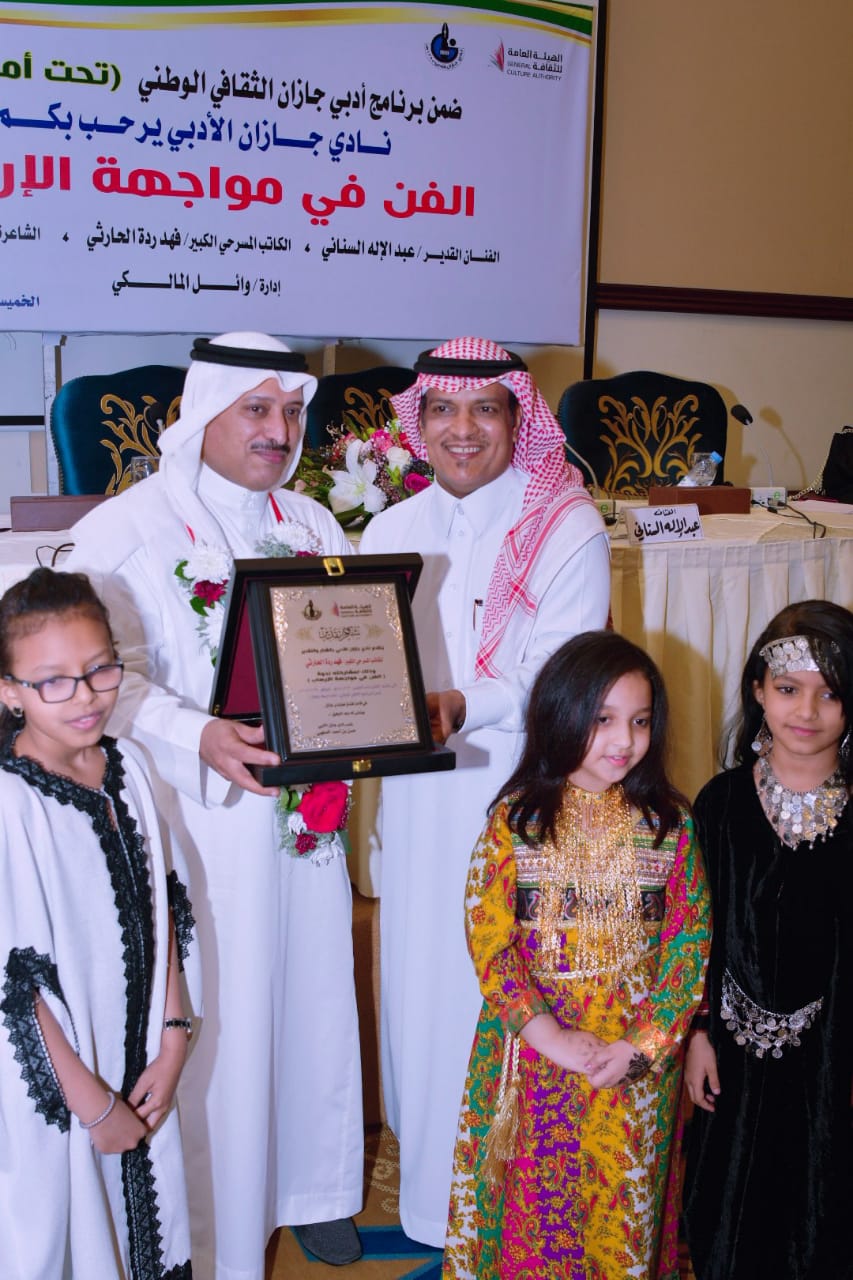 وكرم رئيس نادي جازان الأدبي حسن بن أحمد الصلهبي نجوم الندوة ومديرها منوها بأن هذه الندوة تأتي ضمن البرنامج الثقافي الوطني الذي يقيمه النادي الأدبي تحت شعار ” تحت أمرك ياوطن”.