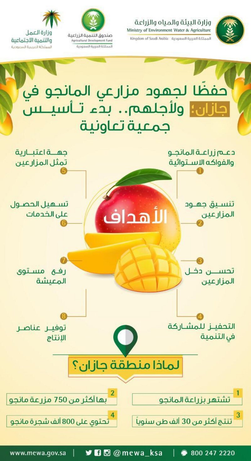 وأوضح مدير عام فرع وزارة البيئة والمياه والزراعة بالمنطقة، المهندس غانم بن حامد الجذعان، أن المزارعين من كل محافظات جازان اجتمعوا اليوم في محافظة صبيا لتكوين جمعية تعاونية تكون جهة اعتبارية لهم، بحضور محافظ صبيا منصور بن زيد الداوود، وممثل الوزارة في مجلس الجمعيات التعاونية المهندس محمد إبراهيم الحيدري، ونائب مدير عام صندوق التنمية الزراعي المهندس أحمد بن عبد الله دراج، ورئيس قسم الجمعيات التعاونية بمركز التنمية الاجتماعية بمنطقة جازان زين بن عيسى جعفري، واتفقوا على تسمية الجمعية بـ(الجمعية التعاونية للمانجو والفواكه الاستوائية بمنطقة جازان) ومقرها محافظة صبيا.