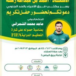 أنهى مكتب فرق الأحياء بالحد الجنوبي بقيادة الأستاذ يحيى علي جبيلي ونائبه عضو رابطة المملكة لفرق الأحياء الأستاذ أحمد عبدالله سهلي كافة الإستعدادت لإقامة حفل تكريم الحكم الدولي ماجد الشمراني وذلك بمناسبة حصوله على الشارة الدولية FIFA.