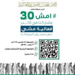 وثمن مدير عام صحة جازان الدكتور عبدالله بن أحمد نجمي رعاية واهتمام صاحب السمو الملكي الأمير محمد بن ناصر بن عبدالعزيز أمير منطقة جازان وسمو نائبه صاحب السمو الملكي الأمير محمد بن عبدالعزيز بن محمد بن عبدالعزيز – يحفظهما الله – لهذه الفعالية التوعوية ” #امش30 ” مؤكداً الحرص على تعزيز ثقافة الرياضة بشكل عام وممارسة رياضة المشي بشكل خاص بما ينعكس إيجاباً على سلامة وصحة الإنسان .
