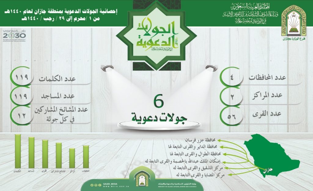 نفذ فرع وزارة الشؤون الإسلامية والدعوة والإرشاد في منطقة جازان ست جولات دعوية خلال السبعة أشهر الماضية توزعت في ست محافظات ومراكز وهي جزر فرسان ، الدائر بني مالك والقرى والمراكز التابعة لها ، الطوال والقرى والمراكز التابعة له ، مركز الشقيق والقرى التابعة له ، المضايا والقرى التابعة له ، اسكان الملك عبد الله التنموي بالحصمة والقرى القريبة منها ،