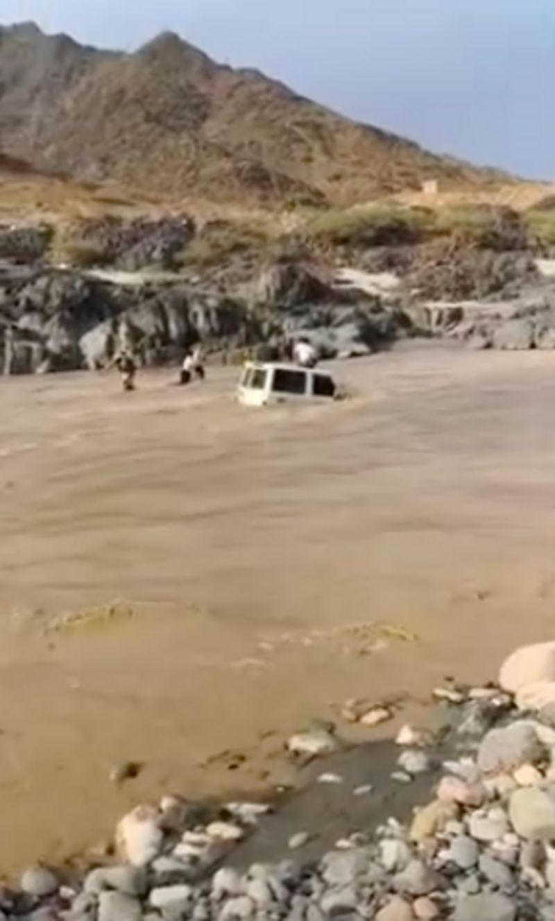أنقذت بطولة شابين سعوديين بتوفيق الله، مواطنًا من الغرق بعدما جرفته السيول في محافظة الريث، حينما كان يهم بعبور الوادي للعودة لقريته التي تحاصرها السيول وتحتجز أهاليها بالداخل والخارج، وسط معاناة مستمرة مع الطريق الذي تقطعه السيول.