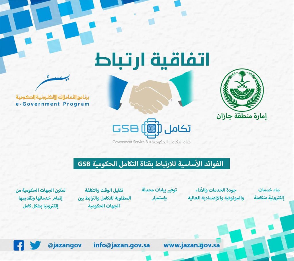 انضمت إمارة منطقة جازان إلى الجهات الحكومية المرتبطة بقناة التكامل الحكومية “تكامل GSB” التي أنشأها ويشرف عليها برنامج التعاملات الإلكترونية الحكومية “يسّر” كأحد مشاريع البنية التحتية الوطنية، وذلك بعد إنهاء كامل متطلبات الربط.