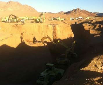 · من يصل لمنطقة أعمال الحفر من المواطنين يتفاجأ بحجم الحفرة التي حُفرت موازية للبئر وتظهر المعدات الضخمة صغيرةً في أسفلها.
