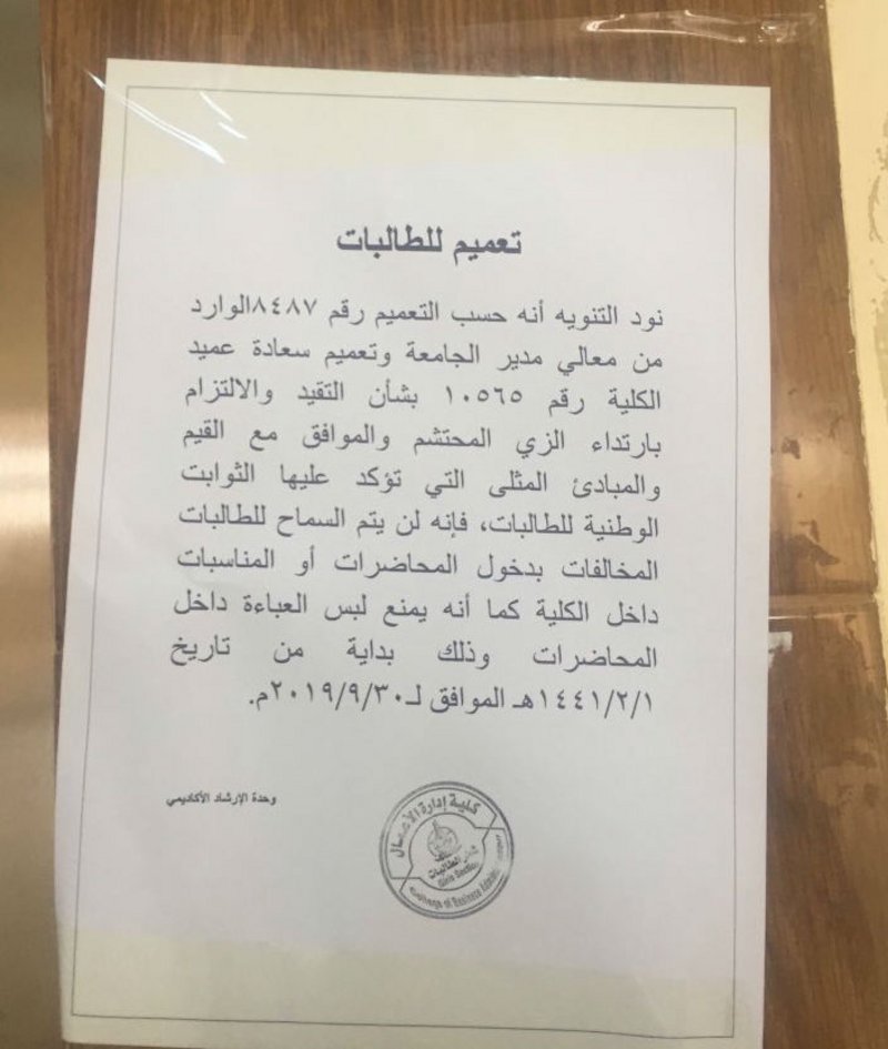 وكانت طالبات بكلية إدارة الأعمال قد أوضحن أنهن فوجئن بتعميم يمنع العباءة، مؤكدات أنهن يحترمن التوجيهات والقوانين الجديدة التي لم تمنع حرية اللبس في ضوء القانون، وتناقلت الحسابات صورة تبيّن قرار المنع.