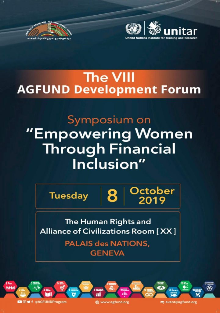 ينظم  برنامج الخليج العربي للتنمية (أجفند) ندوة  دولية بعنوان “تمكين المرأة من خلال الشمول المالي” ، وذلك ضمن فعاليات”منتدى أجفند  التنموي الثامن ، الذي يقام في مدينة جنيف، تحت رعاية صاحب السمو الملكي الأمير عبد العزيز بن  طلال بن عبد العزيز ، رئيس لجنة جائزة الأمير طلال الدولية للتنمية البشرية ( 8 إلى 9 أكتوبر 2019 ) وتشتمل فعالياته أيضا  احتفالية لتكريم  4 مشروعات فائزة  في مجال ” مكافحة الفقر” ، الهدف الأول من أهداف التنمية المستدامة 2030 .