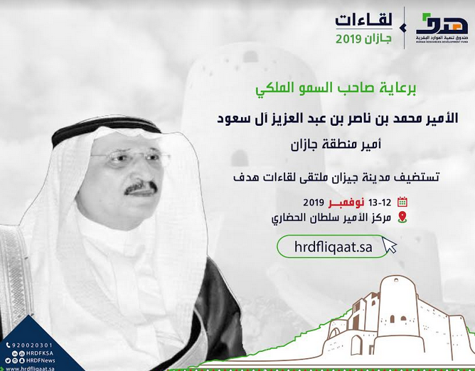 تحت رعاية صاحب السمو الملكي الأمير محمد بن ناصر بن عبدالعزيز أمير منطقة جازان، يعقد صندوق تنمية الموارد البشرية (هدف)، ملتقى لقاءات جازان 2019م، يومي الثلاثاء والأربعاء (12 ـــ 13 نوفمبر)، في مركز الأمير سلطان الحضاري، بهدف الاستثمار في رأس المال البشري، ورفع مهارات وقدرات الكوادر الوطنية.