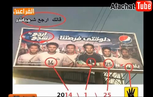 في فيديو يبعث على الضحك، ظهر الإعلامي المصري توفيق عكاشة ليقول إن شركة بيبسي تتآمر مع جماعة الإخوان عبر إعلانها، الذي يظهر فيه لاعبون يحملون الأرقام 1و14 و25، والتي اعتبرها عكاشة ترمز إلى العودة للتجمهر يوم 25 يناير المقبل.