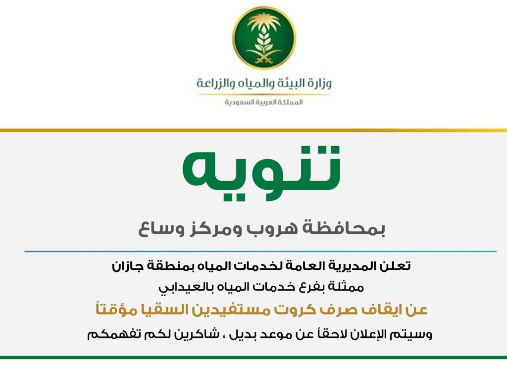 أعلنت المديرية العامة لخدمات المياه بمنطقة جازان ممثله بفرعي خدمات المياه بمحافظة العيدابي وخدمات المياه بمحافظتي الدائر وفيفا عن إيقاف صرف كروت السقيا للمستفيدين في المحافظات التالية: