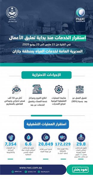 ضخت الإدارة العامة لخدمات المياه بمنطقة جازان خلال الأسبوع الماضي أكثر من 29.8 مليون متر مكعب من المياه لجميع محافظات ومراكز المنطقة خلال الثلاثة أشهر الماضية التي شهدت تطبيق الخطط والإجراءات الوقائية والاحترازية لمنع انتشار فيروس كورونا.