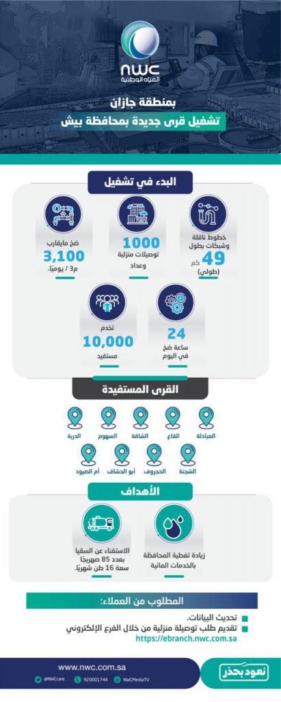 أعلنت شركة المياه الوطنية، ممثلة بالإدارة العامة لخدمات المياه بمنطقة جازان، تشغيلها خدمات المياه لـ 9 قرى في محافظة بيش بضخها 3100 م3يوميًا، وذلك بهدف تعزيز منظومة المياه في المنطقة، وزيادة نسب التغطية، وتحسين الكفاء التشغيلية للخدمات المائية في المحافظة، والاستغناء عن الرحلات الترددية لصهاريج السقيا بعدد 85 صهريجًا شهريًا بسعة 16 طن.
